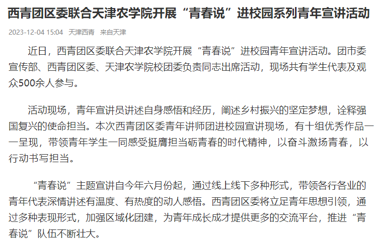 2023年12月4日,津云报道西青团区委联合我校开展“青春说”进校园青年宣讲活动。团市委宣传部、西青团区委、天津农学院校团委负责同志出席活动,现场共有学生代表及观众500余人参与。